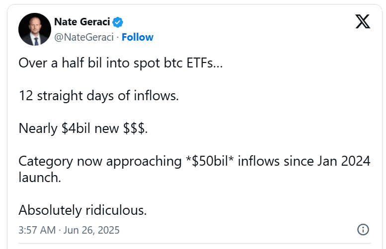 Quase $1,5 bilhão fluiu para ETFs de Bitcoin à vista esta semana, liderado por investidores institucionais que estão impulsionando o mercado. Em apenas três dias de negociação, os totais de entradas em fundos de BTC à vista nos EUA atingiram $1,48 bilhão. Além disso, não houve um único dia de saídas desde 6 de junho.