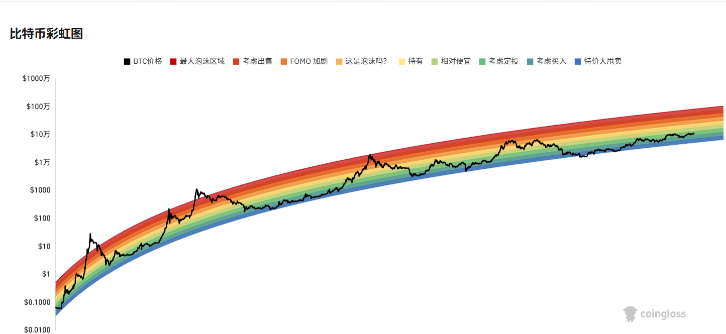 BTC 彩虹图 是一种基于比特币长期对数价格走势,结合多个历史周期的回归带宽绘制的估值可视化工具。