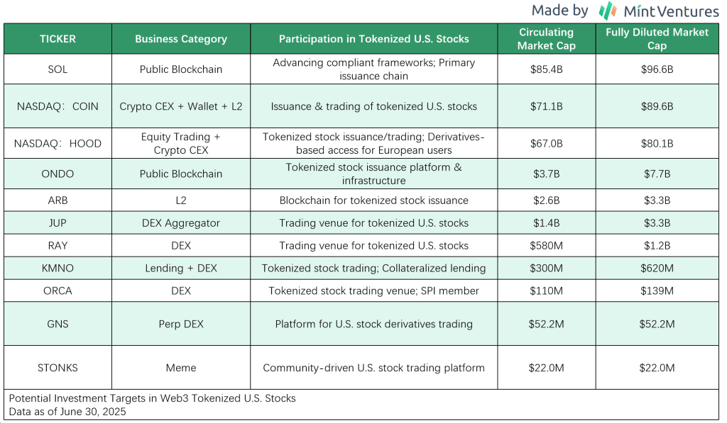 Quanto aos players ativamente envolvidos, os tokens da Coinbase, Solana e Ondo já têm capitalizações de mercado relativamente altas. Além disso, as ações tokenizadas dos EUA não são seu negócio principal. Embora o progresso em ações tokenizadas possa ter alguma influência sobre seus tokens, a extensão desse impacto é difícil de prever.