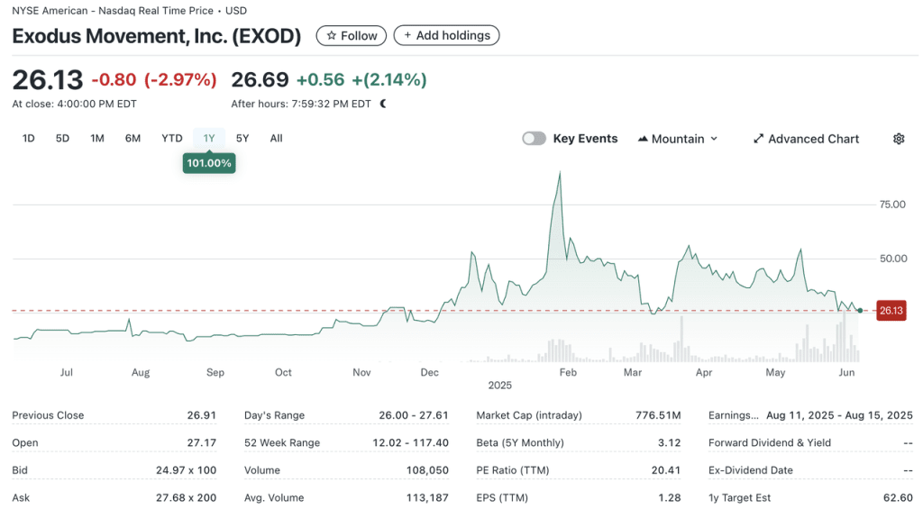 A Exodus é a primeira ação aprovada pela SEC para tokenizar suas ações comuns (ou, para ser mais preciso, a Exodus é a primeira ação tokenizável aprovada pela SEC a ser listada na NYSE). Claro, esse processo não foi uma navegação tranquila. O tempo de listagem da ação da Exodus foi adiado repetidamente desde maio de 2024, e não foi oficialmente listada na NYSE até dezembro.