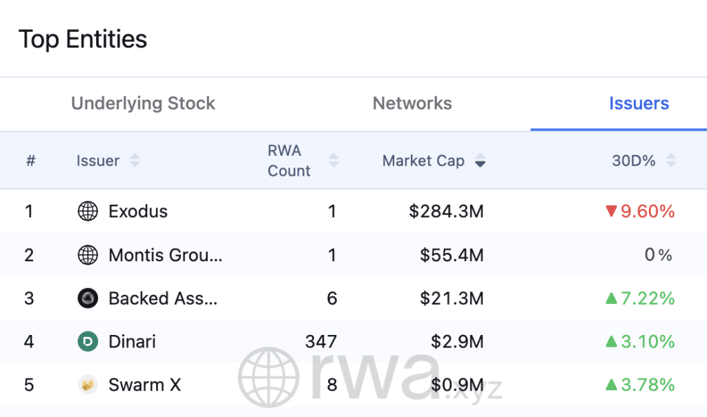 Vamos dar uma olhada nos modelos de negócios da Exodus, Backed Finance e Dinari (o Montis Group visa ações europeias, e a SwarmX é semelhante à Backed Finance, mas em uma escala menor), bem como no progresso de vários outros players importantes que estão atualmente trabalhando em recomendações de negócios de ações tokenizadas dos EUA.