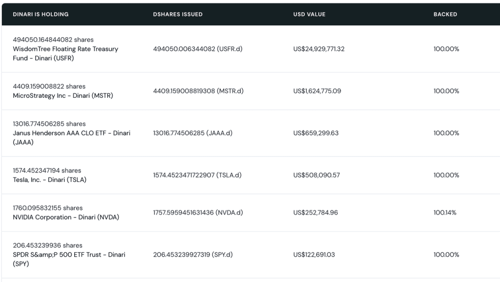 Atualmente, a Dinari opera na Arbitrum, Base e na rede principal Ethereum. Todas as dShares têm uma correspondência de 1:1 com ações do mundo real. Os usuários podem visualizar a ação correspondente às suas dShares através do site oficial da Dinari. A Dinari também pode distribuir dividendos ou desdobramentos de ações para usuários que possuam suas dShares.