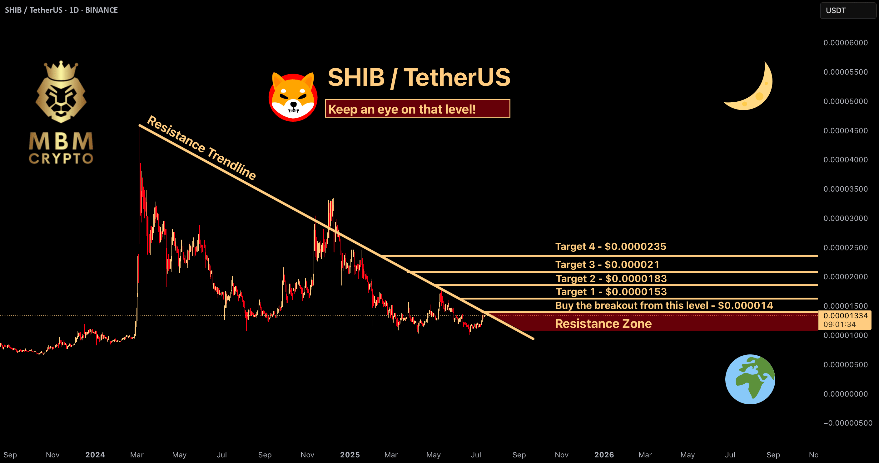 A ideia é: Compre quando o preço ultrapassar $0.000014 e realize lucros nos níveis mostrados no gráfico.