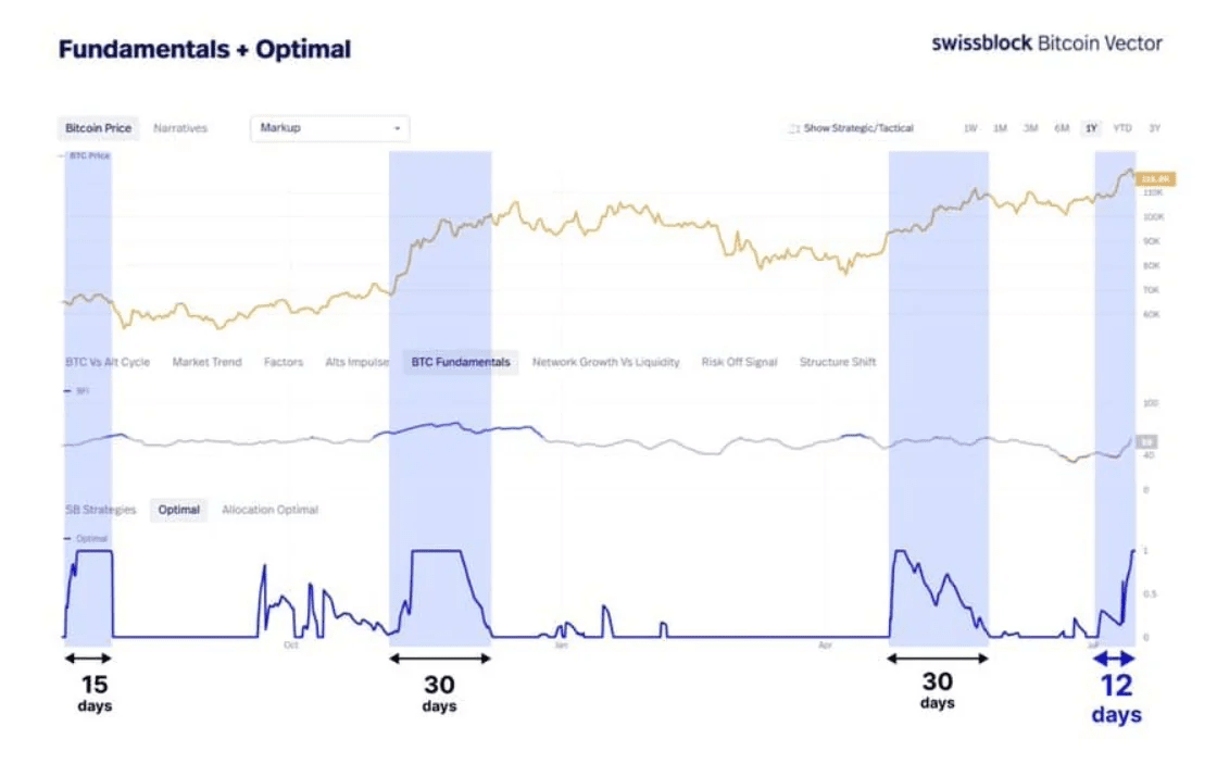 Com base no indicador Optimal Signal do Bitcoin Vector, o Bitcoin está atualmente no dia 12 de seu ciclo de expansão de alta em andamento. Em ciclos anteriores, os ralis geralmente duravam entre 15 e 30 dias. Se a história se repetir, o BTC pode ter mais 3 a 18 dias de momento ascendente antes de entrar em uma fase de correção.