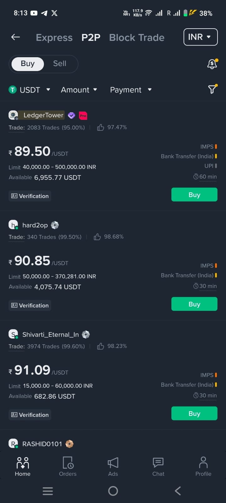 O P2P da Binance permite negociações diretas em INR via UPI, Paytm e Transferências Bancárias.