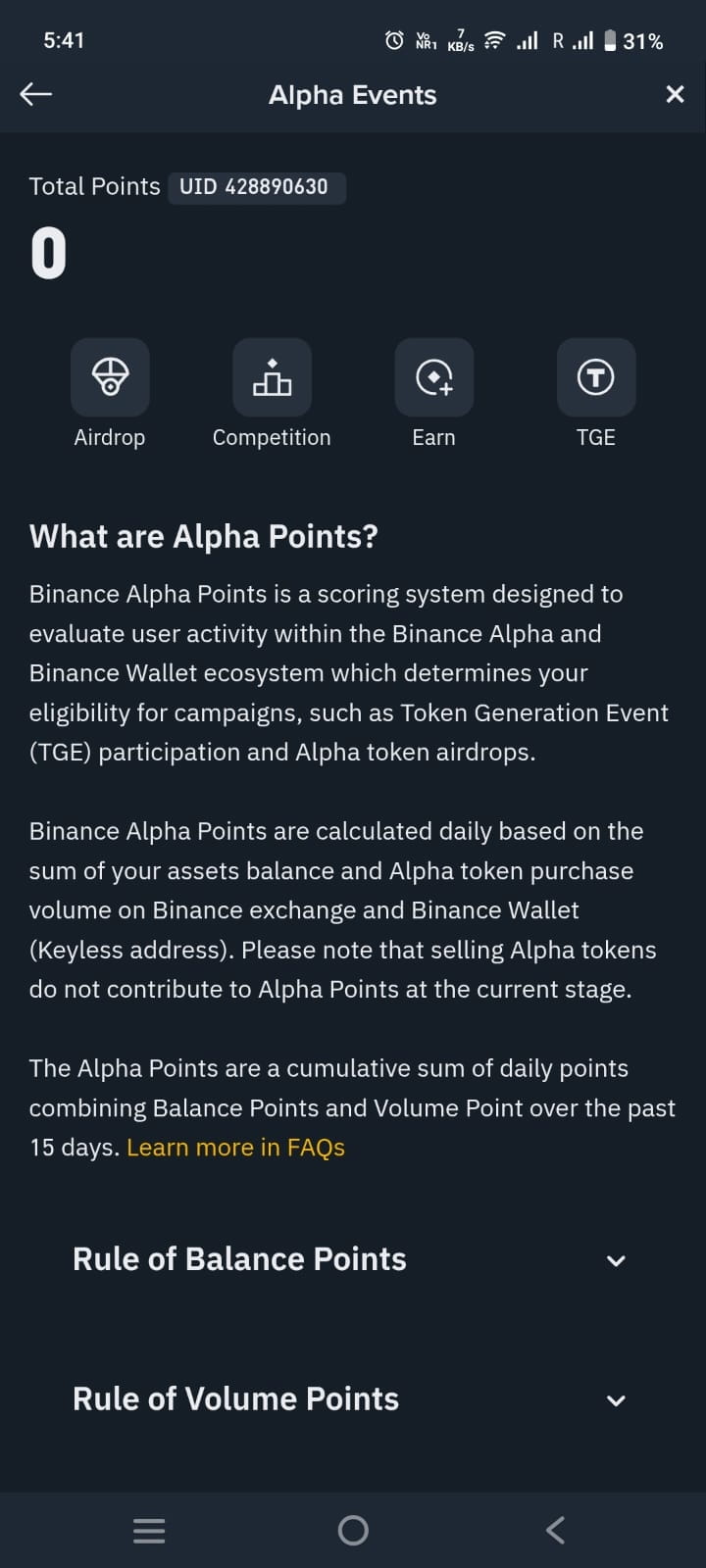 Você pode ganhar recompensas de airdrop no Binance Alpha apenas negociando. Colete Pontos Alpha na seção Alpha para mais pontos, uma alocação de airdrop maior.