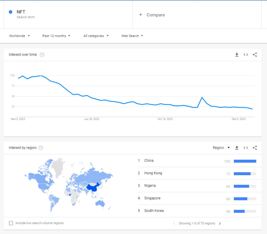 Além disso, o Google Trends mostra que o interesse por NFT disparou, com o pico em janeiro de 2022, com China, Hong Kong e Nigéria liderando o ranking dos três primeiros nos últimos 12 meses. E não apenas o varejo que percebeu seu potencial, mas também grandes marcas em todo o mundo não podem ficar de fora. E aqui estão três das muitas grandes marcas que acreditam e utilizam a inovação em NFT: