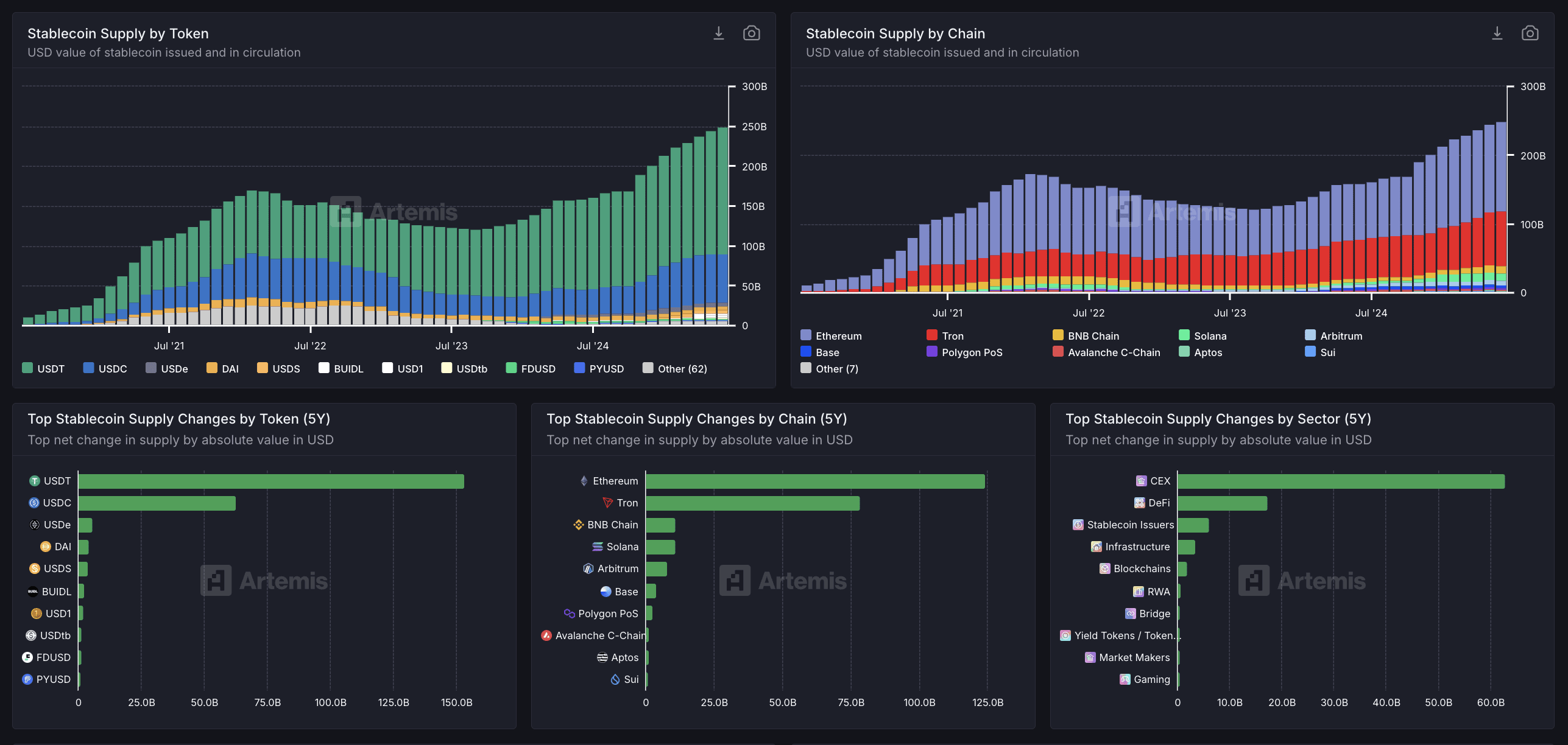 O primeiro sinal dessa mudança é o imenso volume de valor sendo transacionado. O valor total de mercado de todas as stablecoins agora supera $250 bilhões. Embora seja um número significativo, são os dados transacionais que revelam a verdadeira história. Em 2024, as redes de stablecoins processaram $27,6 trilhões, um número que agora supera significativamente os volumes anuais de gigantes de pagamento como Visa ou Mastercard.