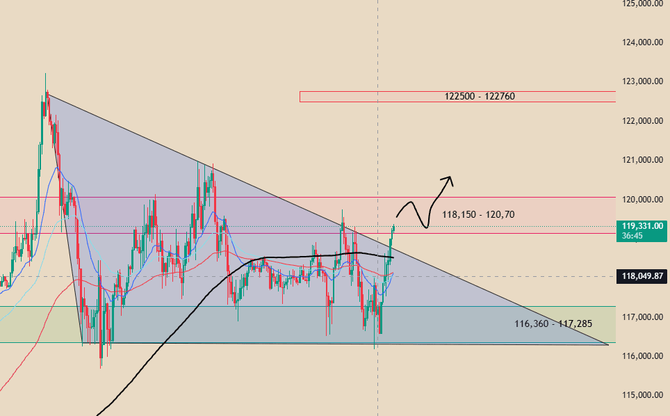 Sem dúvida, estamos testemunhando um Triângulo Descendente e o preço está entrando acima da zona de $118k, mas ainda há chances de uma correção devido à alta resistência.