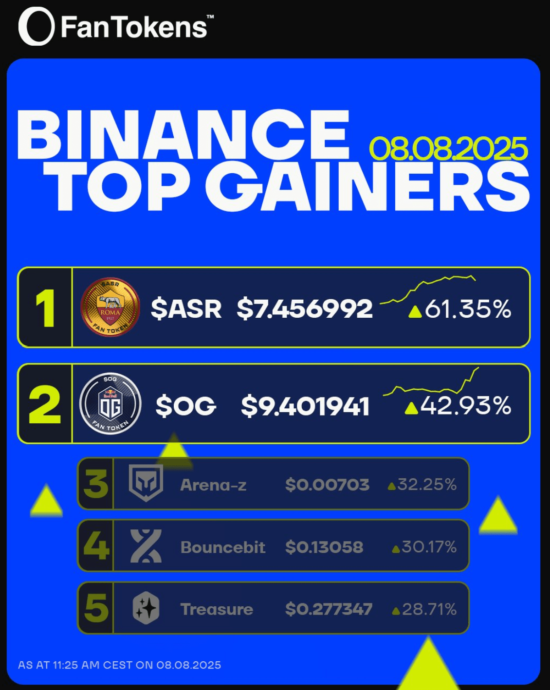 Após um mês espetacular em que tanto a AS Roma ($ASR) quanto o OG Fan Token ($OG ) atingiram marcos importantes não vistos em anos, ambos os tokens ocuparam o 1º e 2º lugares na lista dos maiores ganhadores diários da Binance.