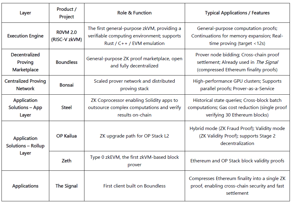 O ecossistema do RISC Zero se estende a partir da zkVM, formando gradualmente uma matriz completa que abrange as camadas de execução, rede, mercado e aplicação: