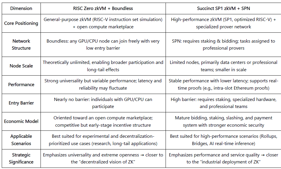 Em contraste, o RISC Zero segue uma estratégia de "motor duplo": a Bonsai fornece um Prover-as-a-Service hospedado oficialmente, com alto desempenho e estabilidade de nível empresarial, enquanto a Boundless constrói um mercado de provas aberto e descentralizado que permite a participação de qualquer nó de GPU/CPU, maximizando a descentralização e a abrangência, embora com desempenho menos consistente.