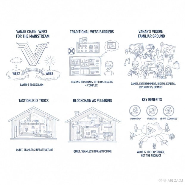 Vanar Chain presents itself as a Layer-1 built with a very specific belief about how Web3 actually becomes mainstream, because instead of assuming the next wave of users will arrive through trading terminals and DeFi dashboards, it assumes they will arrive through things they already understand and already spend time in, like games, entertainment, digital experiences, and brand communities, where blockchain is not the product but the plumbing that quietly makes ownership, transfers, and in-app economies work without friction.