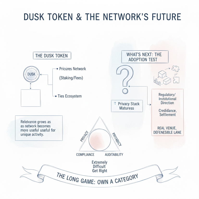 Quando você pergunta o que vem a seguir, a resposta depende de um simples teste que o mercado eventualmente aplicará, que é se a Dusk se torna um lugar onde ativos regulados reais e fluxos de trabalho financeiros reais realmente operam em escala. Se sua pilha de privacidade continuar a amadurecer de uma forma que os desenvolvedores possam construir de forma confiável, e se a direção regulatória e institucional resultar em aplicações que tragam emissão, negociação e liquidação credíveis para a rede, então a Dusk deixa de ser uma "narrativa de privacidade" e começa a ser um local real com uma faixa defensável. Se essa adoção não chegar, então permanece uma história de engenharia impressionante que ainda não encontrou seu ajuste completo no mercado, mas a maneira como o projeto está estruturado deixa claro que eles estão mirando no longo prazo, porque privacidade mais conformidade mais auditabilidade é um triângulo que é extremamente difícil de acertar, e os projetos que acertam podem acabar dominando uma categoria em vez de competir em uma multidão.