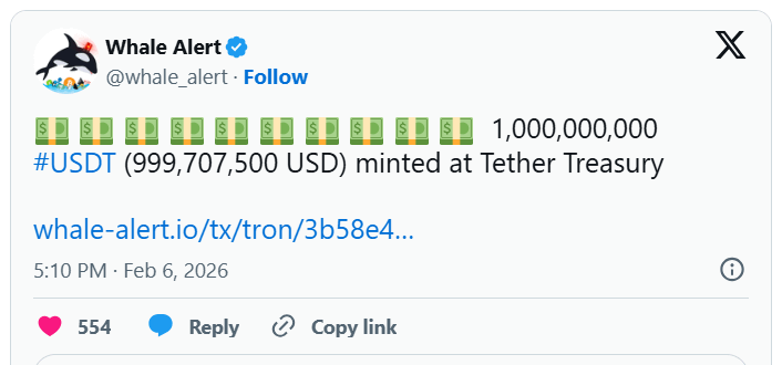 On-chain trackers flagged the latest mint at the Tether Treasury, adding to a series of large issuances seen over the past week. Earlier this week, two separate $1 billion USDT mints were recorded, bringing Tether’s February total to $3 billion.