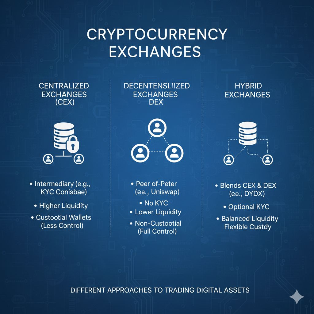 À medida que o uso da criptomoeda cresceu, ativos e títulos baseados em cripto surgiram. Esses são negociados em trocas de cripto especializadas, que vêm em três tipos principais: