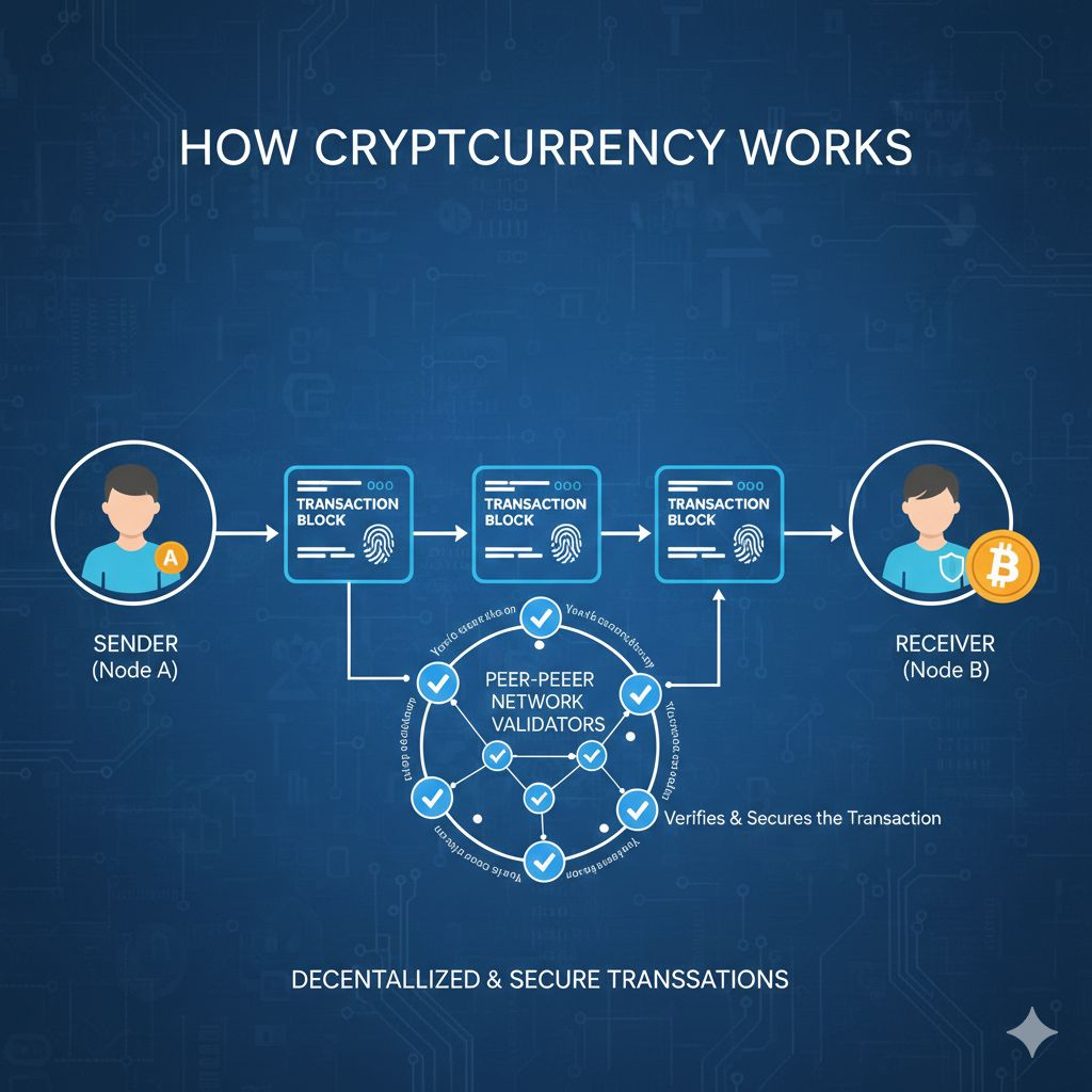As criptomoedas operam em redes peer-to-peer usando software de código aberto, permitindo que qualquer pessoa participe. As transações são garantidas pela tecnologia blockchain, e cada criptomoeda mantém sua própria blockchain para garantir segurança, rastreabilidade e integridade.
