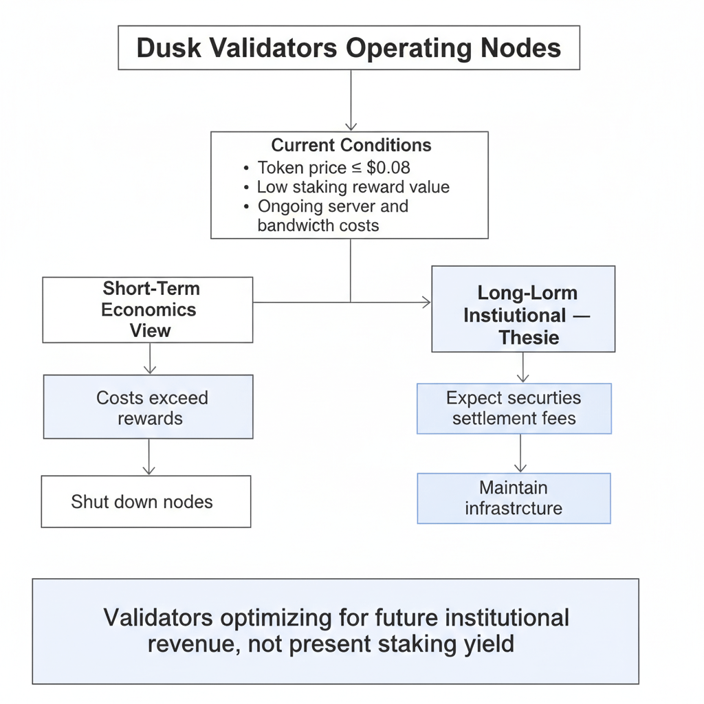 Os validadores Dusk que operam a US$ 0,0864 estão fazendo uma aposta específica na DuskTrade e na NPEX que, segundo a precificação de mercado, está errada. Operar nós nesses níveis de preço significa que as recompensas de staking denominadas em DUSK, no valor de US$ 0,0864, provavelmente não cobrem os custos operacionais. Despesas com servidores, largura de banda, tempo de manutenção — todos esses custos permaneceram constantes enquanto o valor em dólares das recompensas despencou 74%. A lógica econômica básica diz que o fechamento deve ocorrer quando os custos excedem a receita.