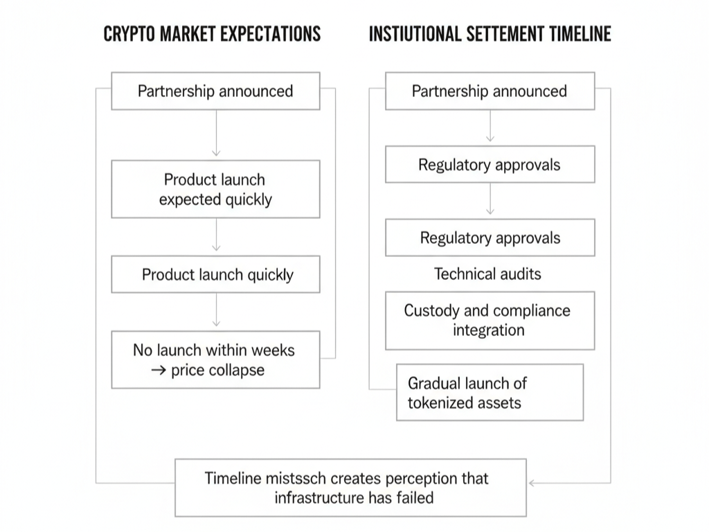 O que torna esse compromisso do validador interessante é o que ele revela sobre os prazos de liquidação de títulos. As finanças tradicionais operam em prazos medidos em trimestres e anos, não em semanas e meses como as criptomoedas. Se a NPEX estiver realmente se preparando para tokenizar títulos e migrar a negociação para a infraestrutura da Dusk, as aprovações regulatórias, a integração técnica, as soluções de custódia e a preparação operacional podem facilmente levar de 6 a 12 meses, mesmo após o anúncio da parceria.