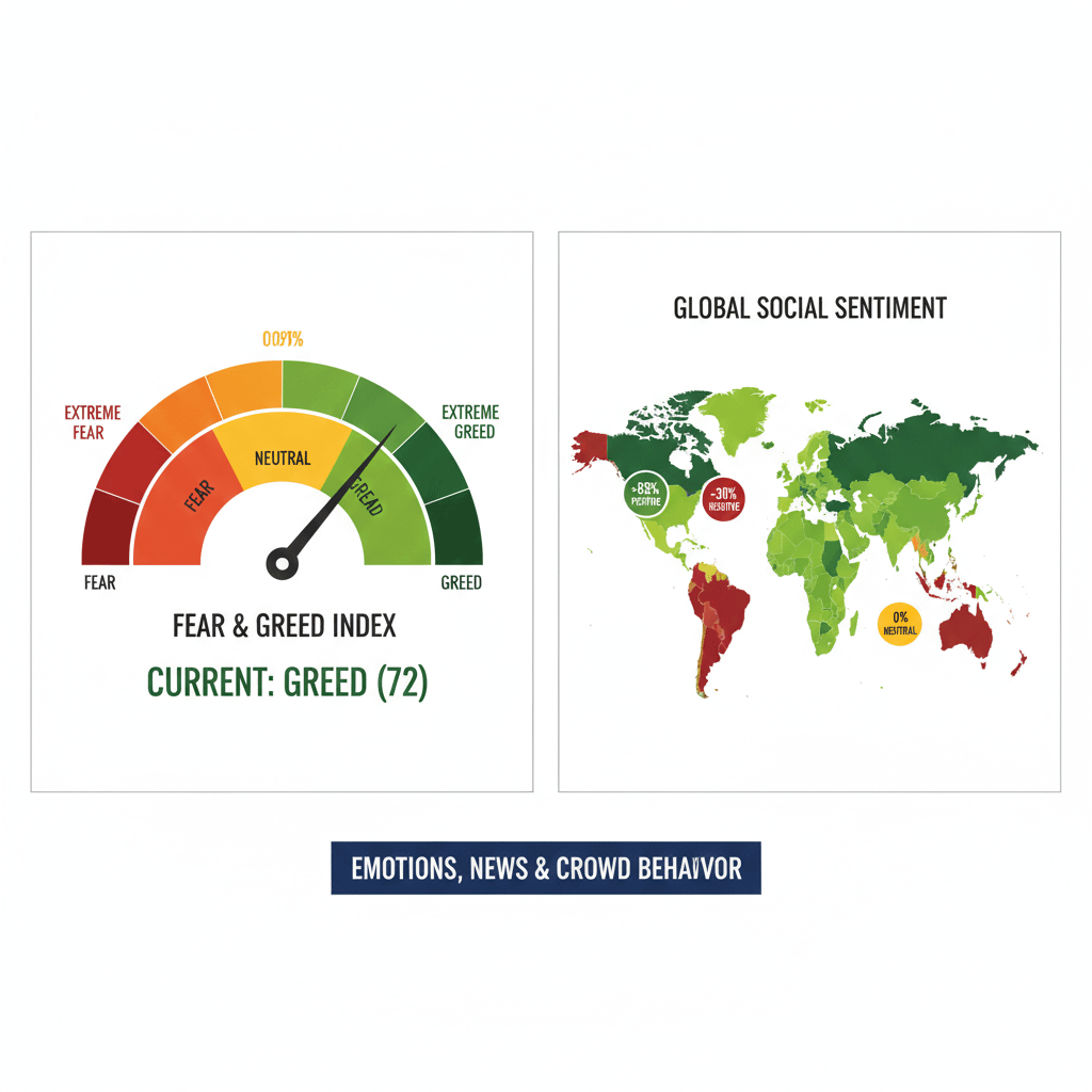 O sentimento de mercado é a sensação geral de traders e investidores em relação ao mercado. Reflete emoções como medo, ganância, confiança e incerteza, e essas emoções frequentemente movem preços antes que qualquer indicador técnico o faça.