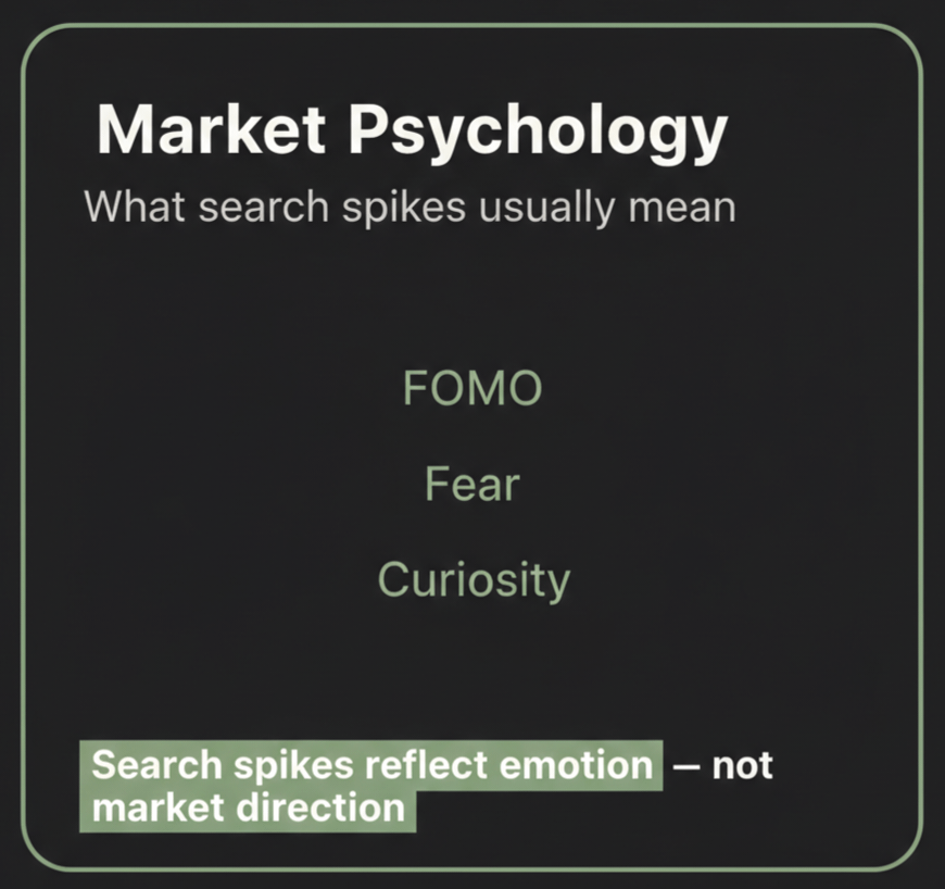 Mansikta ka balance: Ek tarah se, search spikes humaare mann ke halat ka snapshot dete hain. Agar anek log bajaar ke upar ke hisse ko dekh rahe hain, to woh caution se feel kar sakte hain ki top aa raha hai. Traders ke liye Google Trends ek signal ki tarah hai: extreme spikes se market “exhaustion point” ka andesha ho sakta hai. Matlab agar sab log suddenly padhna-chahna shuru kar dein, toh aksar picture ye hi hoti ki cycle apne end ke kareeb hai.