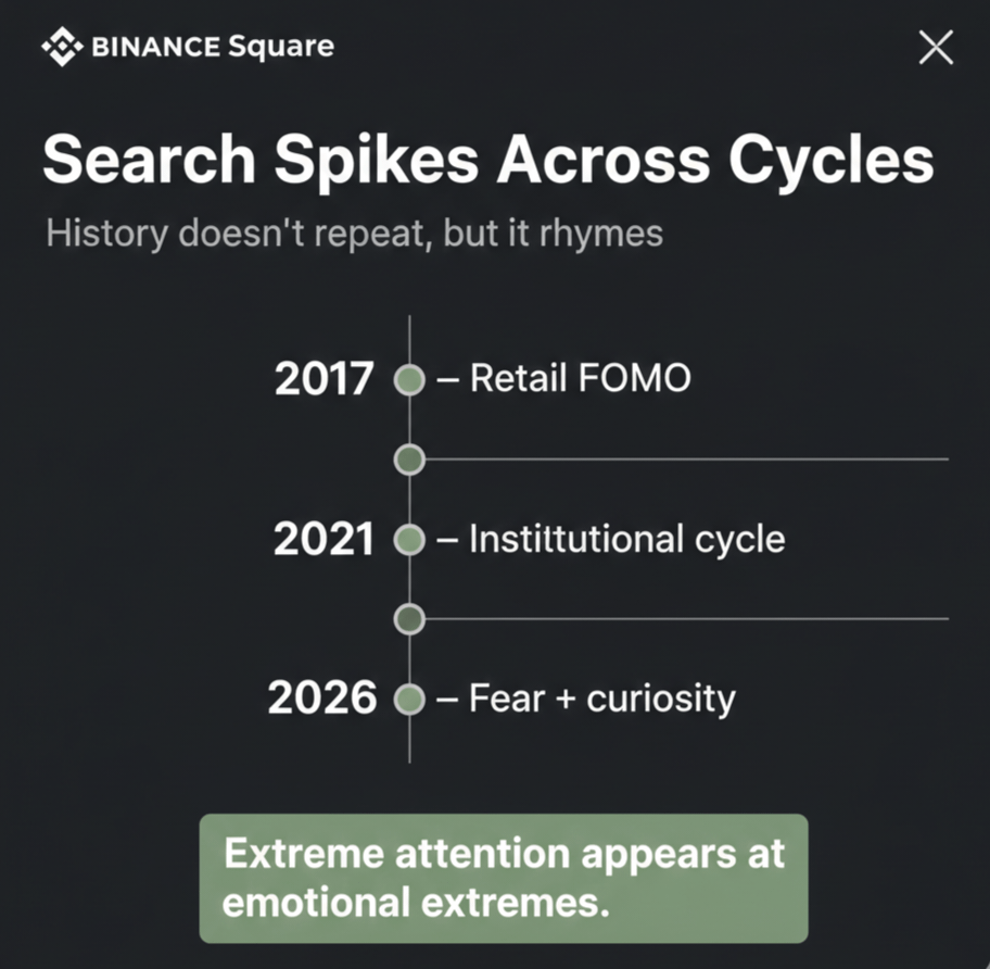 Recent comparisons: February 2026 wala spike pehle se milta-julta nazara (pattern) hai. Crypto reports batate hain ki 1 Feb 2026 ko search index 100 pe gaya, jo pichhle saal se sabse zyada tha. Usse pehle November 2025 mein bhi ek search spike dekha gaya tha jab BTC $100k se neeche aaya tha. Matlab, jab bhi tezi se dam ghata ya rally hui hai, public interest wahin badhi hai. Ek dusri baat: har search peak price top nahi hota – kabhi market ke bottom par bhi sab izzat dekhte hain (people searching “Bitcoin price prediction” jab girawat ho jati hai). Isliye historical pattern ke hisaab se, search spikes batate hain ke curve strong hai, par exact trend confirm karna mushkil hai.