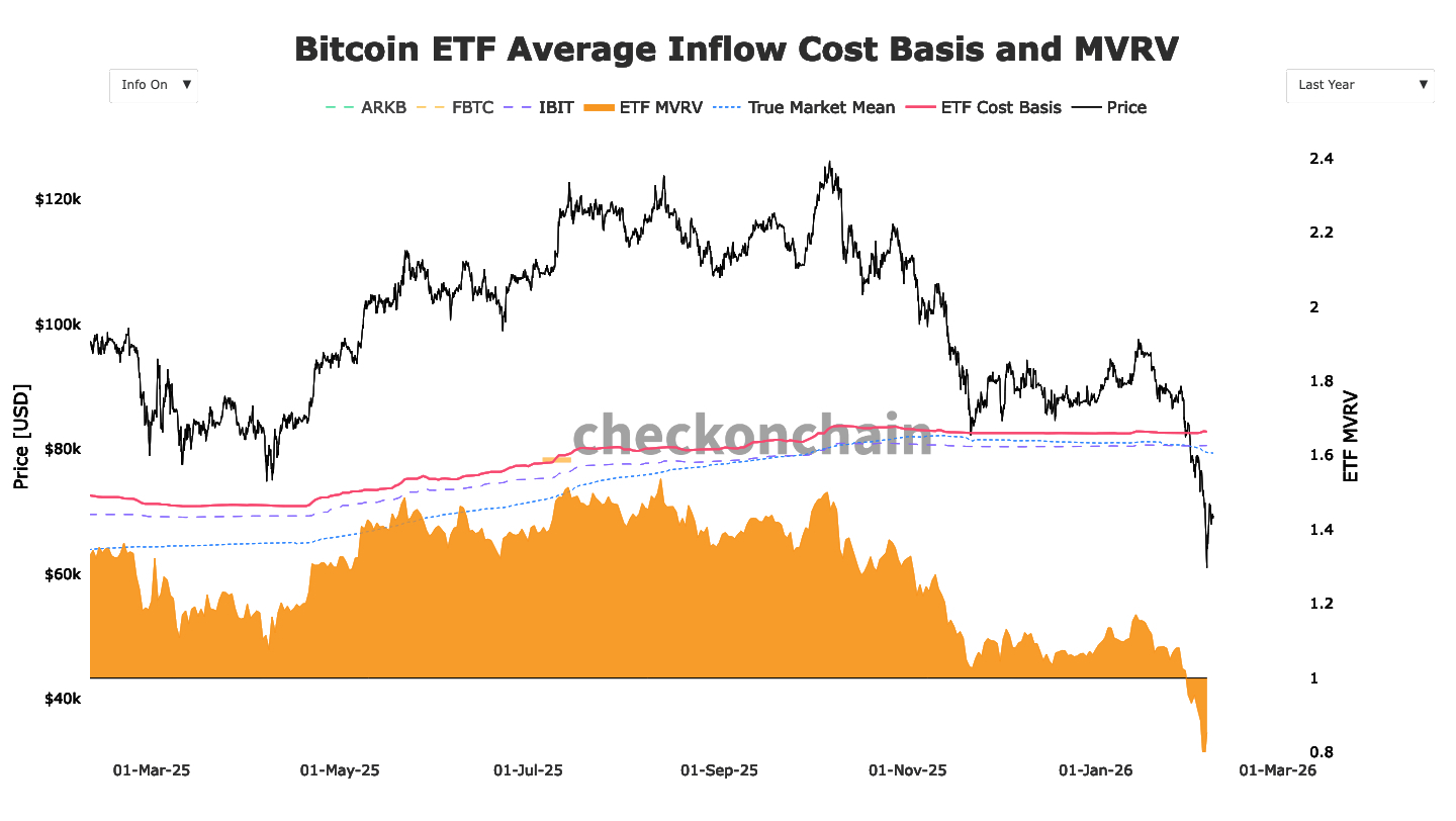 Os fundos de investimento em Bitcoin negociados em bolsa (ETFs) nos EUA atualmente têm um custo médio de entrada de $82,000, segundo dados da fonte de monitoramento Checkonchain.