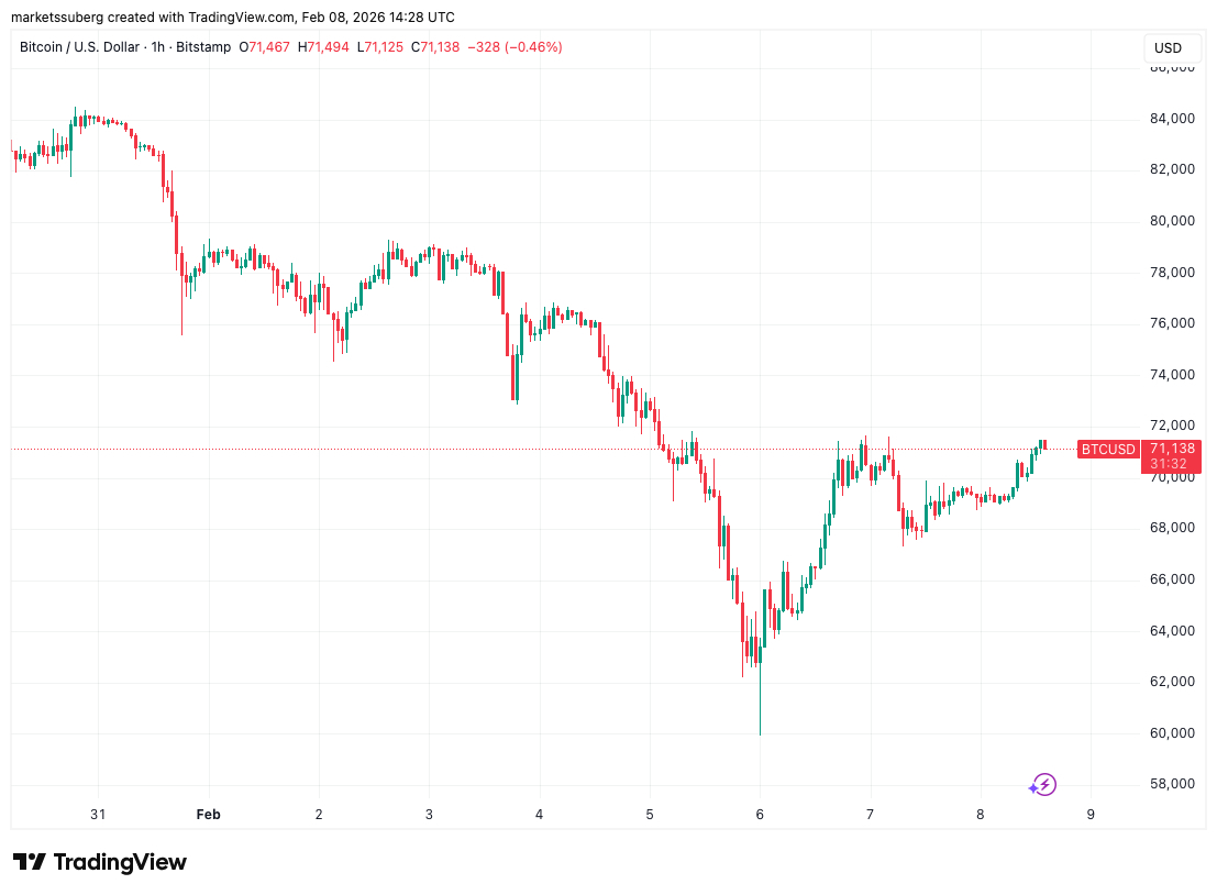 Dados do TradingView mostraram BTC/USD cruzando $71,000, agora em alta de 20% em relação aos mínimos de 15 meses de sexta-feira.
