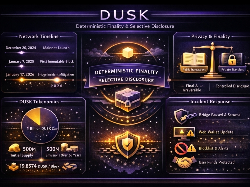 The subtle point is that selective disclosure only feels safe if finality is strong. If outcomes can wobble, then the act of revealing anything becomes a risk you might have to repeat, defend, or unwind. Dusk reduces that risk by making the timeline of “this is done” clean. When the world is calm, that sounds like a nice-to-have. When the world is messy—when counterparties disagree, when someone claims they didn’t receive funds, when a regulator asks why a record changed—finality becomes the difference between a conversation and a conflict.On December 20, 2024, Dusk began launching its network. By January 7, 2025, it reached the point where the first record was made that no one can change.That date matters because it marks the moment Dusk stopped being “almost real” and became a place where mistakes could have consequences. It’s one thing to design a chain for regulated reality. It’s another thing to live inside the operational cadence of it, where users expect continuity and the team has to treat incidents as governance and risk, not as drama.