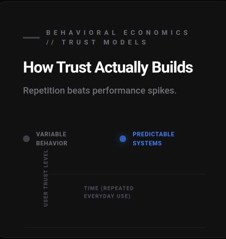 Essa filosofia de design também afeta como as pessoas aumentam a confiança. Em sistemas construídos para extremos, a confiança é condicional. Os usuários confiam no sistema quando as métricas parecem boas, quando as condições são favoráveis, quando nada inesperado acontece. Em sistemas construídos para o meio, a confiança se torna ambiente. Não depende de verificar nada. É apenas assumida.