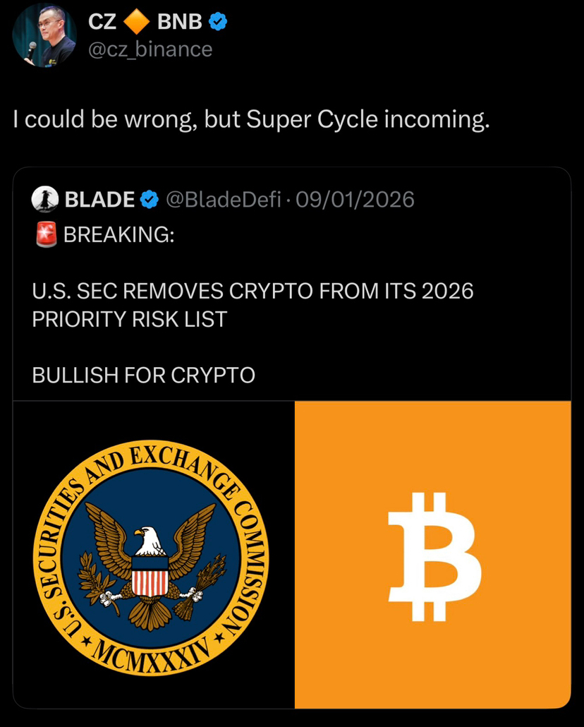 CZ falou muitas vezes sobre um super ciclo. Não como uma bomba de um dia. Não como um número mágico. Mas como um longo processo. Uma fase onde a demanda muda para sempre. Uma fase onde o capital para de se comportar como dinheiro rápido e começa a se comportar como dinheiro de longo prazo.