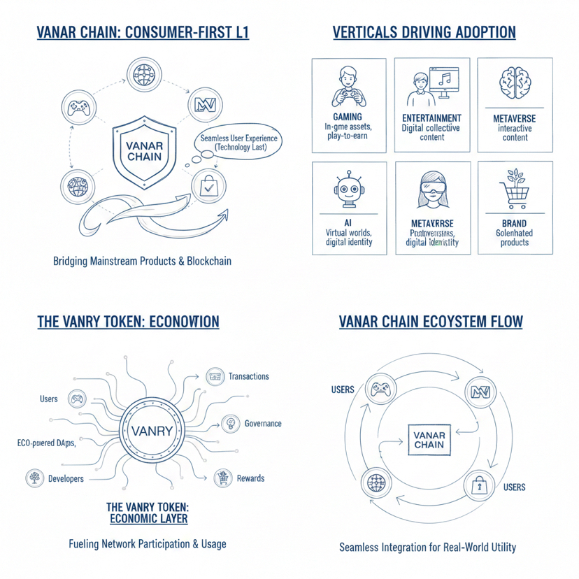Vanar Chain está em uma área que muitos projetos falam, mas muito poucos conseguem realmente tornar prático, porque está tentando fazer com que um Layer 1 pareça pertencer a produtos mainstream onde os usuários se importam primeiro com a experiência e depois com a tecnologia, e o projeto continua ancorando essa direção em verticais voltadas para o consumidor, como jogos, entretenimento, experiências no metaverso, IA, iniciativas ecológicas e soluções de marca, com o token VANRY atuando como a camada econômica que torna a participação e o uso possíveis em toda a rede.
