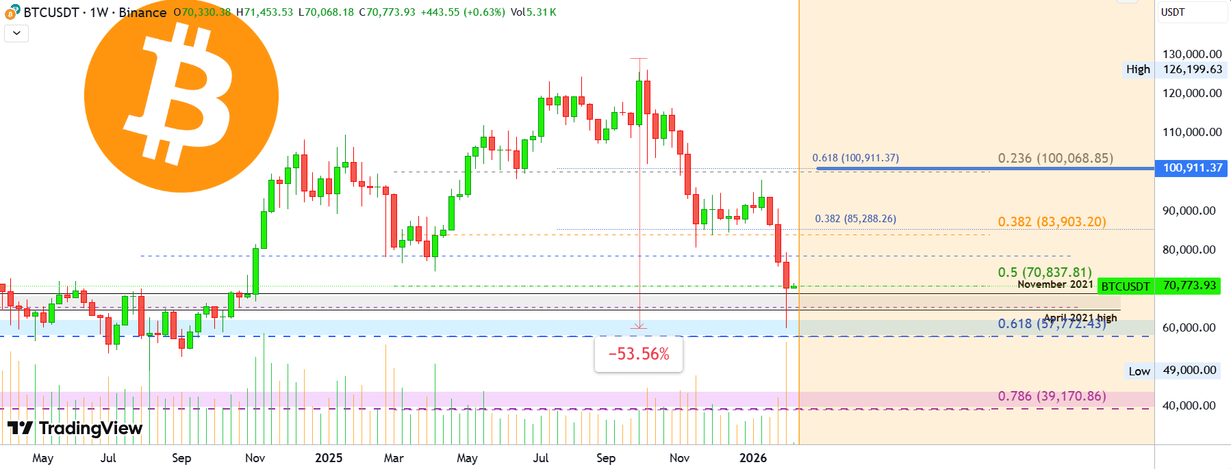 O fundo da correção atingiu $60.000 em uma vela. Vários níveis de suporte foram perfurados. O fechamento da sessão semanal ocorreu a $70.330.