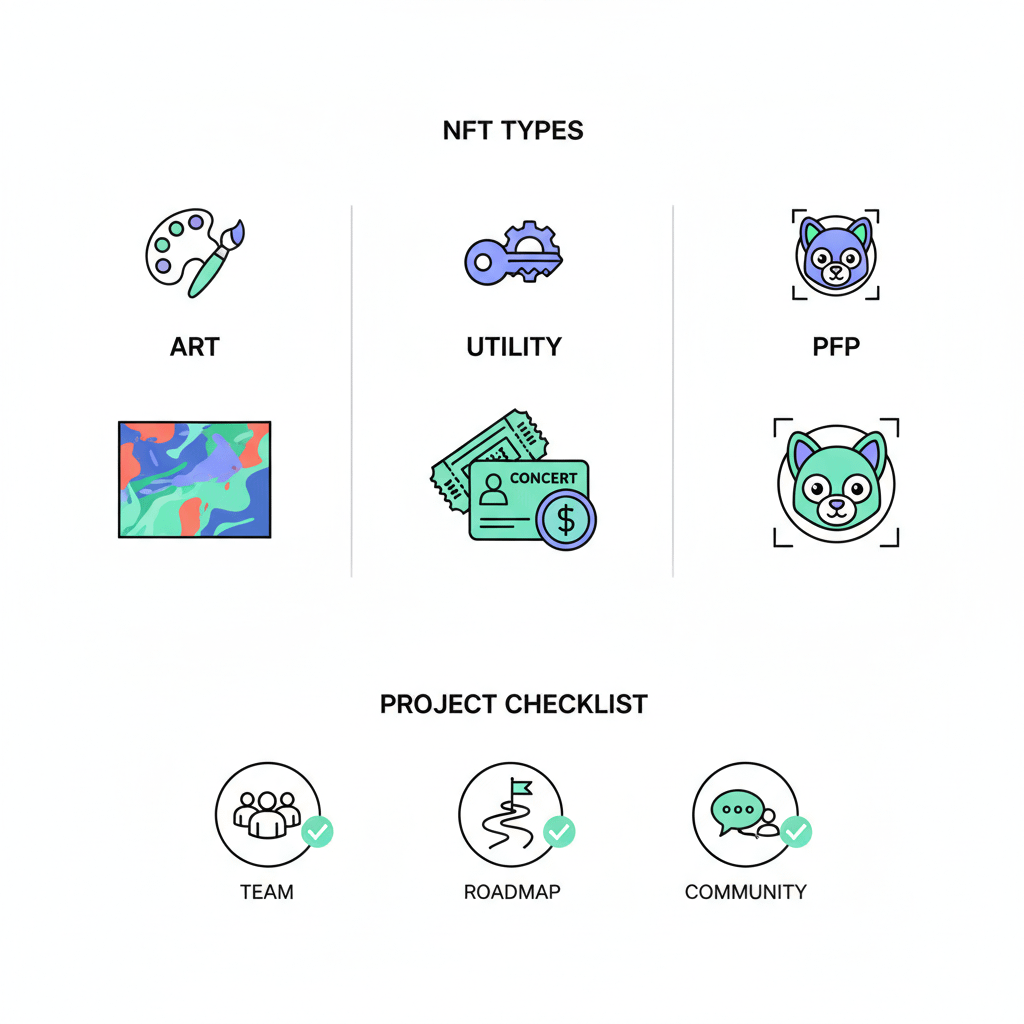 Nem todos os NFTs são iguais: alguns são arte, destinados a serem colecionáveis e orientados pela comunidade, outros são NFTs de utilidade que dão acesso a aplicativos, jogos ou benefícios exclusivos, e PFPs são fotos de perfil que às vezes trazem benefícios sociais. Antes de investir, aprendi que é crucial verificar o projeto, olhar para a equipe, o roadmap e quão ativa é a comunidade, porque apenas o hype raramente dura.