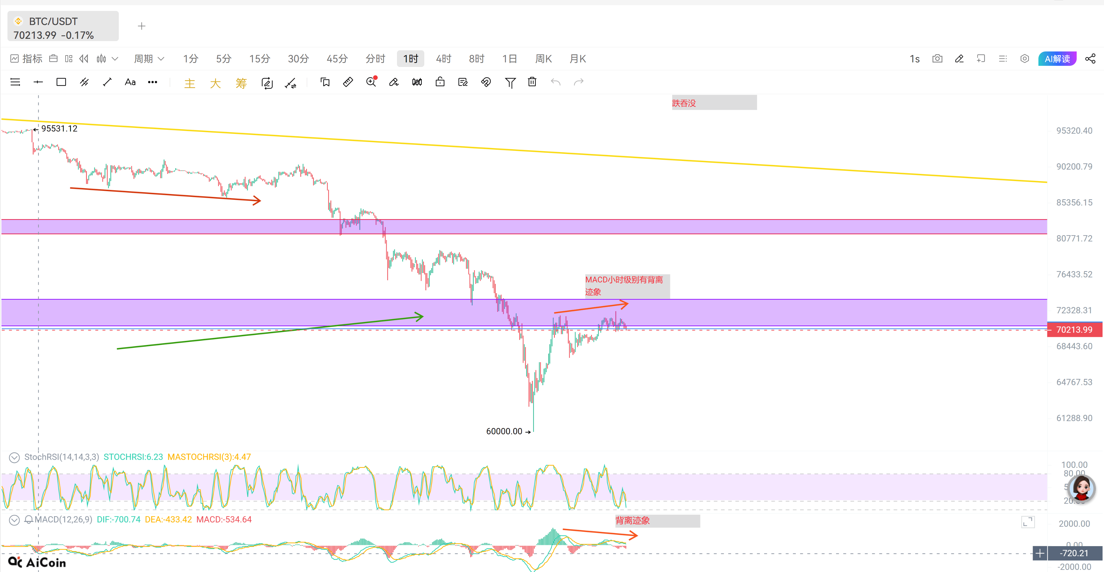 大饼目前报价70000左右,我们前面有讲过大饼很可能走5浪下跌结构,果不然,下图1:大饼近期走出了3浪下跌到60000附近后进入4浪反弹阶段,最高反弹至72000附近,5浪将跌至50000附近。我们再看图2,小时级别MACD已经有顶背离迹象,需要修复,短期二探新低的概率很大,所以,我们还是看反弹不会太多,毕竟目前也属于熊市周期,看70000-71000位置能否站稳,上方74500左右强压力,极限压力80000附近,警惕多头幻想,