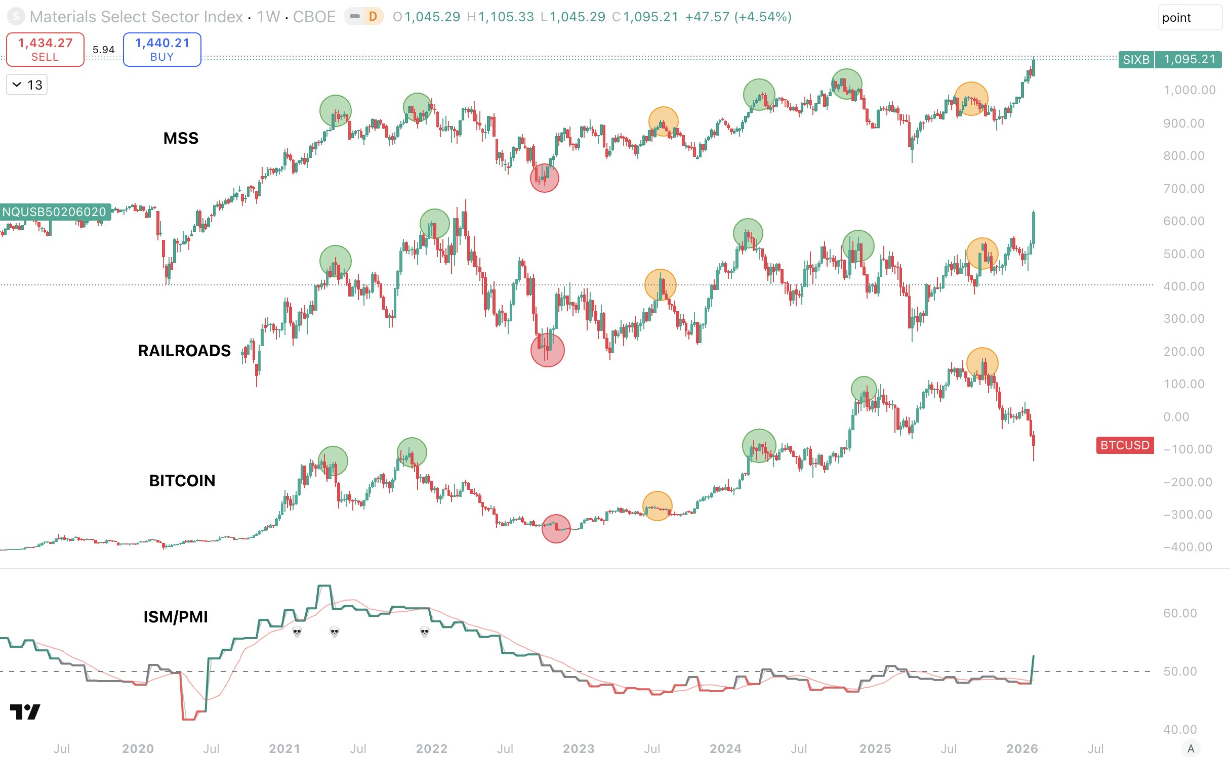 Quando você sobrepõe o Setor Seletivo de Materiais (MSS), Ferrovias dos EUA, Bitcoin e ISM/PMI, uma relação impressionante aparece. Historicamente, o Bitcoin acompanha esses ativos cíclicos, sensíveis à economia de maneira notavelmente eficaz. Altos semelhantes, recuos semelhantes no meio do ciclo, baixos semelhantes.