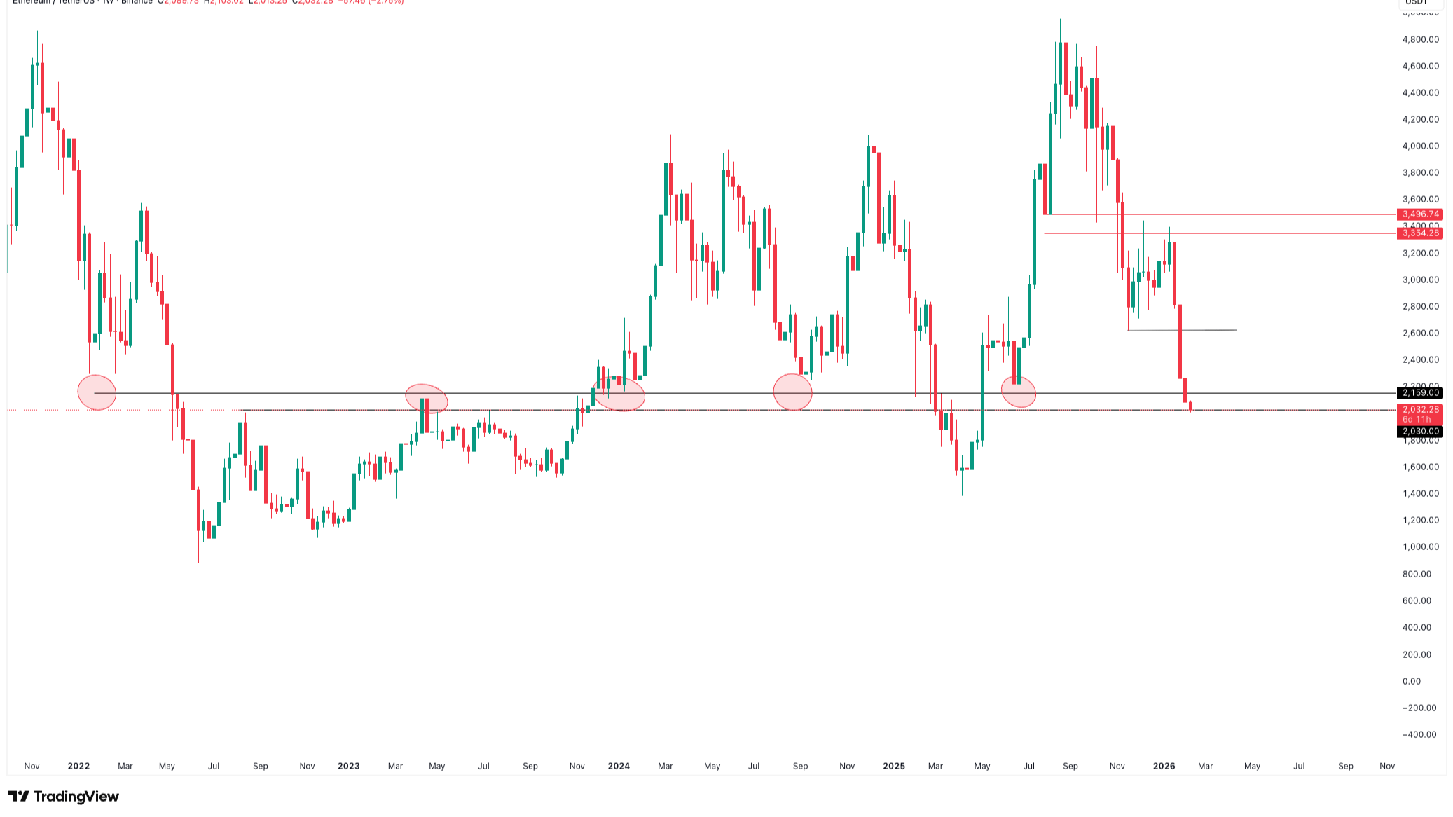 It’s the question nobody wants to ask, but everyone is thinking. A clean break and a daily close below $1,980 would likely trigger a capitulation event. Without the $2,000 floor, the next meaningful support isn't until the $1,750–$1,800 region, which served as the absolute bottom during the 2025 flush.