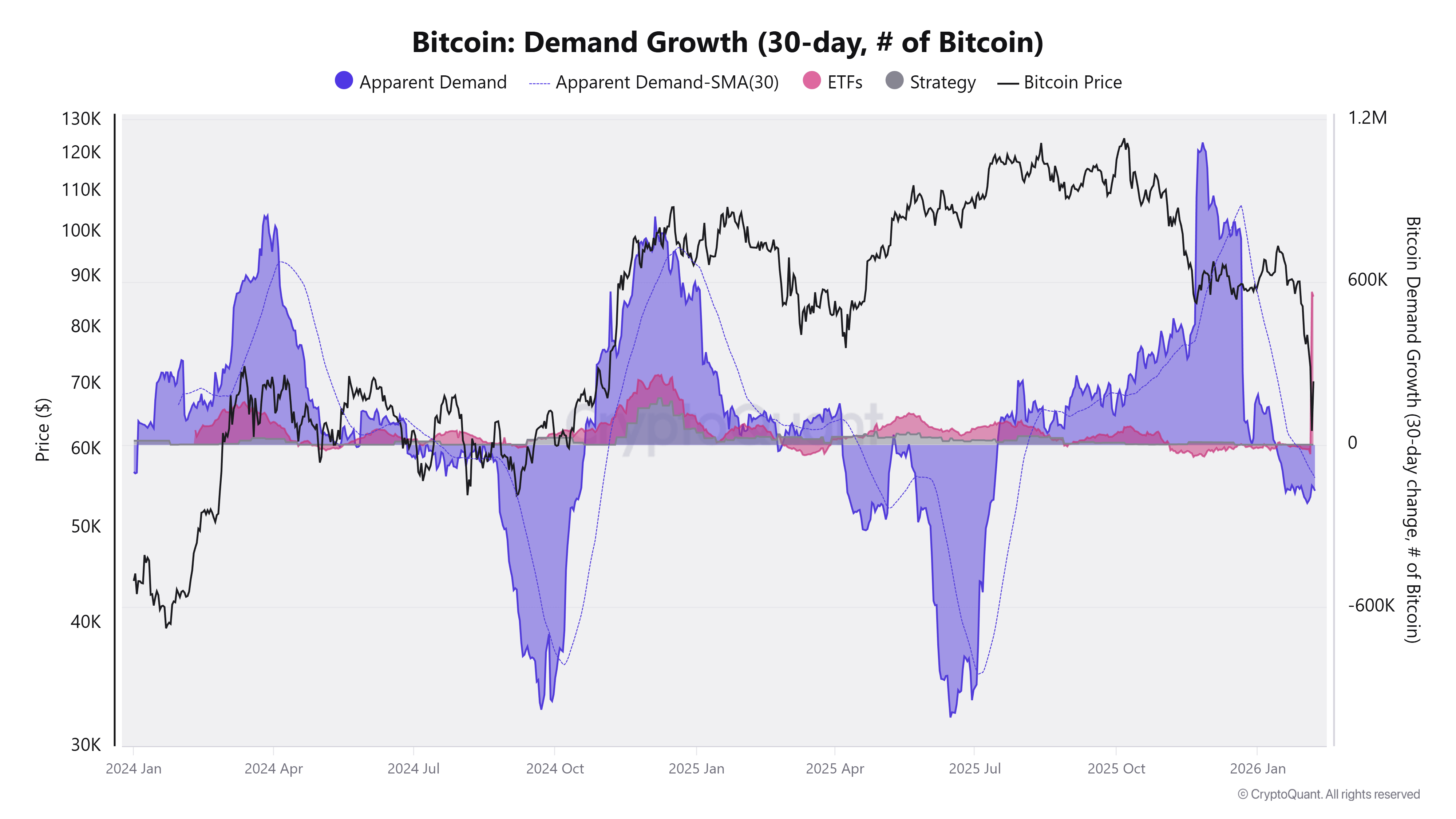 Dividir a demanda em componentes estruturais reforça essa desaceleração. Os fluxos de ETF, que anteriormente atuavam como uma oferta marginal dominante, se estabilizaram, enquanto a acumulação relacionada a estratégias também se estabilizou após explosões anteriores de expansão. Com a demanda institucional não acelerando mais, a divergência entre a acumulação contínua do Dolphin e a demanda agregada em declínio cria uma estrutura de mercado transitória onde a oferta é absorvida, mas o momento de alta permanece contido até que o crescimento da demanda reaqueça.