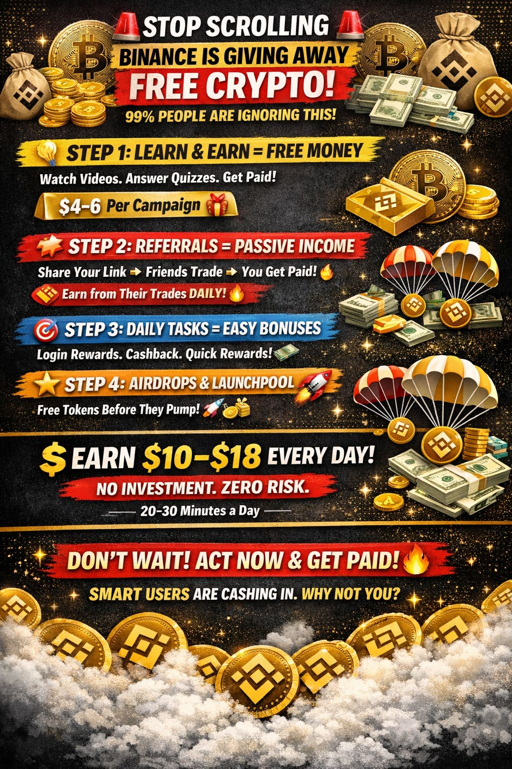 Binance literally PAYS YOU to learn, click, share, and stay active.
