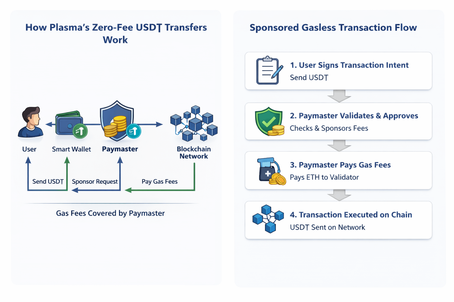 Por trás dessa simplicidade está o pagador. O Plasma utiliza um fluxo de estilo de abstração de conta onde uma terceira parte concorda em patrocinar as taxas de transação. Neste caso, o próprio protocolo é frequentemente o patrocinador. Em vez de o usuário anexar gás, a transação é agrupada com a promessa de que outra pessoa pagará o validador. O usuário assina a intenção. O pagador acerta a conta.