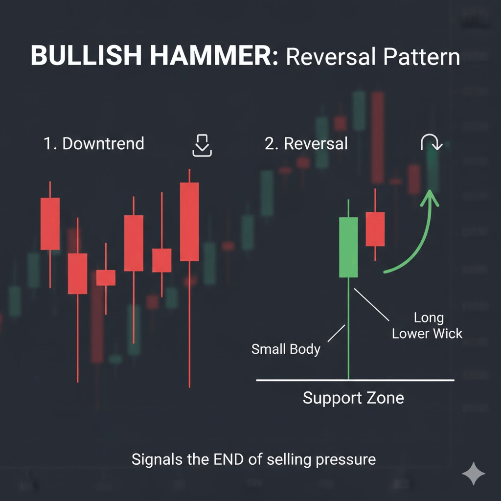O Martelo ocorre na parte inferior de uma tendência de baixa. É caracterizado por um pequeno corpo na parte superior e uma longa sombra inferior.