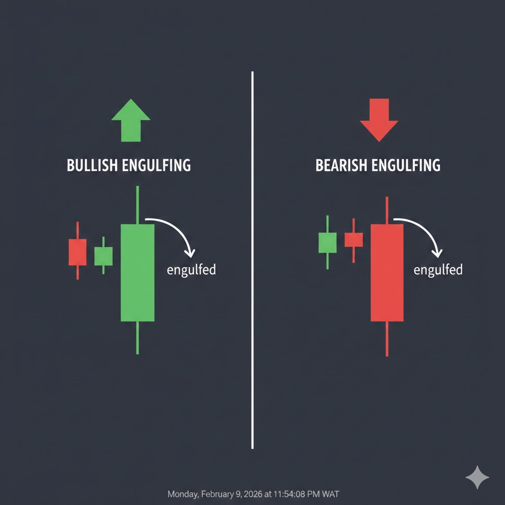 Esses consistem em duas velas e indicam uma tomada total de controle por um lado do mercado.