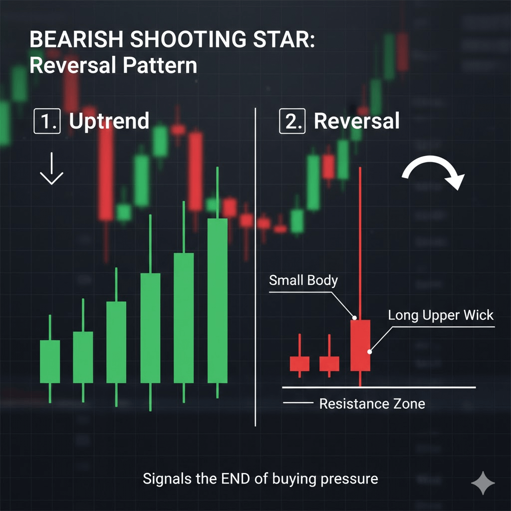 Pense nisso como o gêmeo maligno do Martelo. Ele aparece no pico de uma tendência de alta e apresenta uma longa sombra superior com um pequeno corpo na parte inferior.