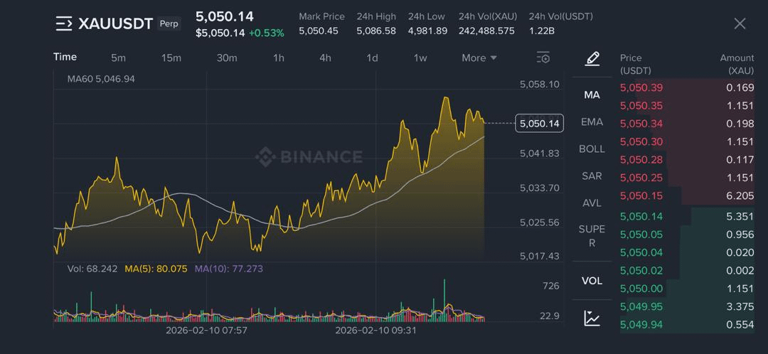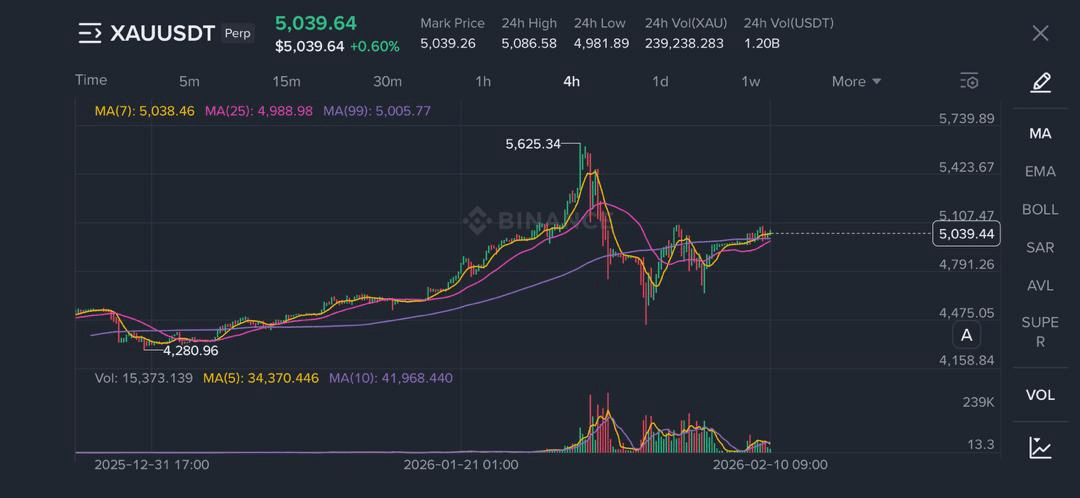 Na sombra da queda angustiante do Bitcoin em 2026—onde a criptomoeda despencou para $60,000 em um crash relâmpago em 5 de fevereiro, perdendo mais de 50% de seu pico em outubro de 2025 de $126,000 e alinhando-se com a representação do gráfico fornecido pelo usuário de uma fase de baixa de 364 dias dentro de seu ciclo de halving de quatro anos - #GOLD emergiu como um paradigma de estabilidade e crescimento. Em 10 de fevereiro, o ouro à vista é negociado em torno de $5,050 por onça, um nível que não só consolida seu papel como um porto seguro, mas também reflete um notável ganho de 74% ano a ano, superando amplamente a volatilidade do Bitcoin.