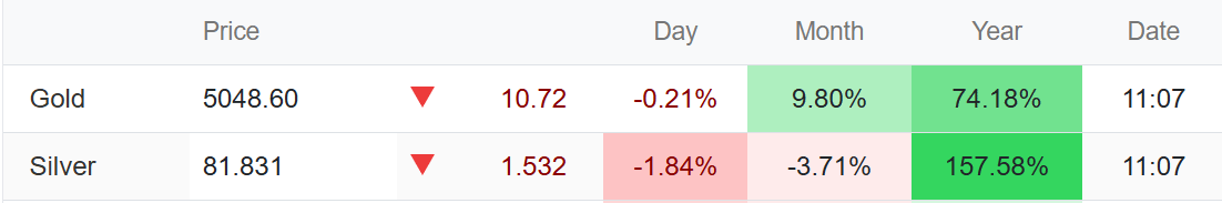 A prata amplificou esse momento, subindo 150% desde o início de 2025 para perto de $85 por onça, comprimindo a razão ouro-prata para cerca de 59:1 e sugerindo mais alta em aplicações industriais. O setor de metais preciosos, incluindo ações de mineração, seguiu o exemplo, com índices como o NYSE Arca Gold Miners mostrando ganhos em meio a margens elevadas.