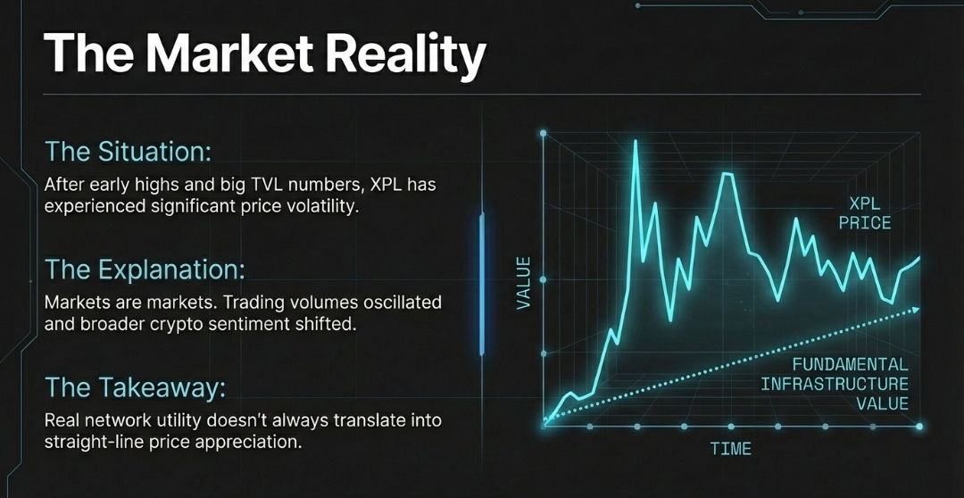 Here’s the part I want everyone reading this to reflect on critically. When Plasma launched mainnet, it had a period of real excitement with early token activity, big TVL numbers, and DeFi integrations. But markets are markets. After early highs, XPL has experienced significant price volatility and pulls as trading volumes oscillated and broader crypto sentiment shifted.