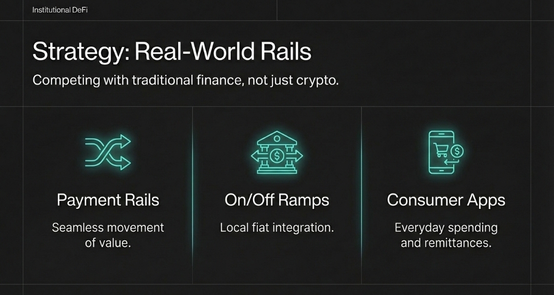 This is where you see the real ambition: building something that competes with traditional rails, not merely adding convenience for crypto-native users.