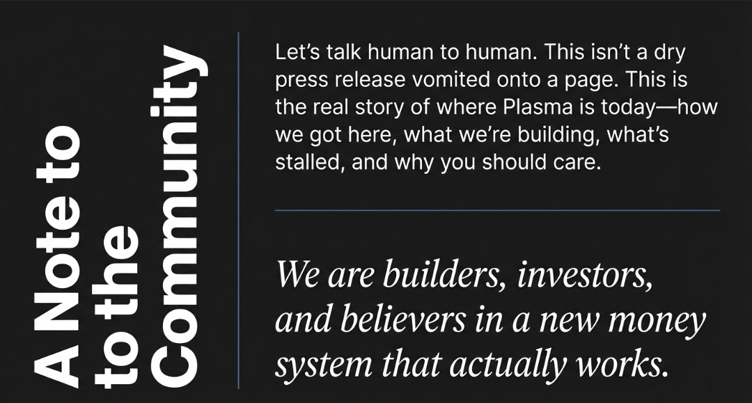 Let me talk to you like one human to another about what’s been unfolding with Plasma, its XPL token, and the bigger picture we all care about as builders, investors, and believers in a new money system that actually works. This isn’t some dry press release vomited onto a page. This is the real story of where this project is today how it got here, what it’s building, what’s stalled, and why you should care.
