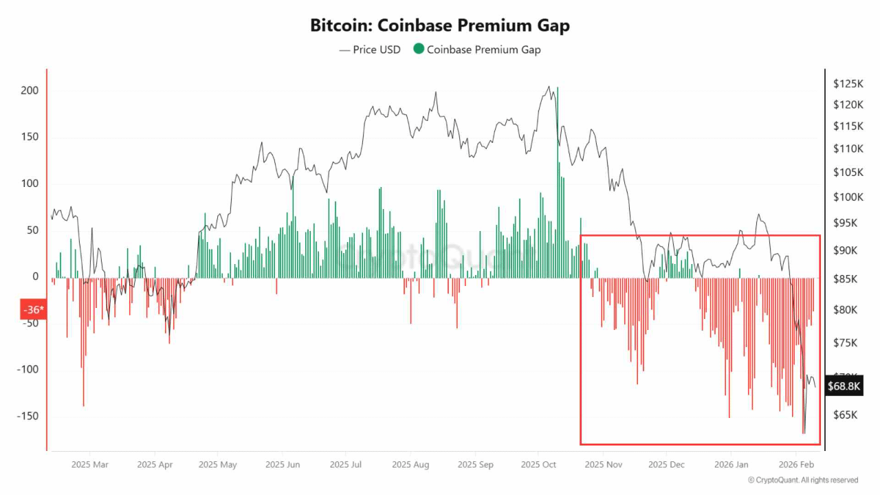 Neste contexto, o Bitcoin continua vulnerável a movimentos de risco de curto prazo, semelhante a ações, mesmo que as expectativas de afrouxamento futuro possam desencadear recuperações. A qualidade dessas recuperações é fundamental. Desde o final de 2025, o Gap de Prêmio Coinbase permaneceu persistentemente negativo, sinalizando uma demanda fraca no mercado à vista dos EUA e uma ação de preço impulsionada em grande parte por derivativos. Em inícios anteriores de mercado em alta, este prêmio se estabilizou em território positivo - condições que ainda não foram atendidas hoje.