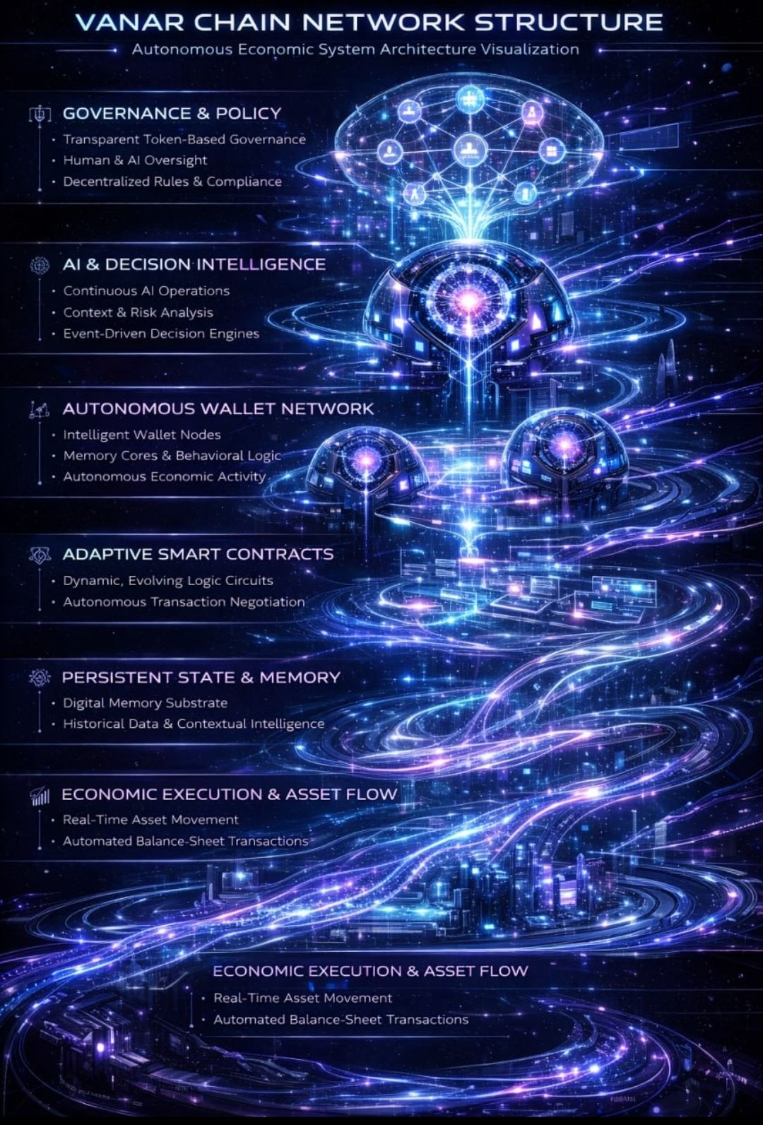 Vanar Chain é o primeiro exemplo da evolução de uma estrutura de blockchain transacional para uma estrutura econômica autoconsciente. É a primeira estrutura econômica composta por carteiras auto-operantes, sistemas inteligentes baseados em máquinas e sistemas transacionais adaptativos. Vanar é a primeira rede de entidades digitais em um mundo governado pelo comércio baseado em máquinas para realizar operações inteligentes além da capacidade de transacionar.